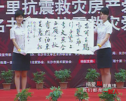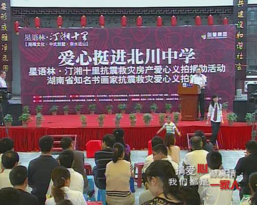 2008年5月12日,汶川大地震。舉國悲坳,舉世震驚。5月24日,湖南賽德拍賣有限公司攜手長沙創(chuàng)普房地產(chǎn)開 發(fā)(集團(tuán))有限公司、湖南紅十字會等單位聯(lián)合組織了"愛心挺進(jìn)北川中學(xué)--星語林·汀湘十里愛心房產(chǎn)暨省內(nèi)書畫名家 筆會作品義拍"賑災(zāi)活動。